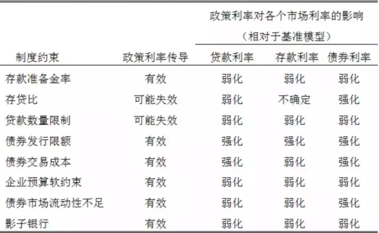 第三章对基准静态模型进行扩展,得出了存贷比、对贷款规模的数量限制、高存款准备金率、软预算约束、影子银行套利、债券市场流动性不足等都会制约利率传导效率的结论。