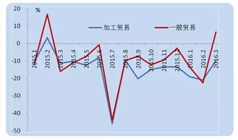 图4 2015年以来一般贸易和加工贸易月度进出口增速