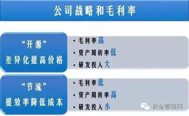公司的战略和毛利率基本关系是什么,要不我用开源,要不就是节流。所谓的开源我通过差异化来提高价格,如果是节流,我提高效率来降低成本。我为了开源我就要把毛利率做得很高,资产的周转率可能会降低,这种情况我就把研发投入可能做得比较大一点。但是我为了节流,有可能他的毛利率是要低一点的,但是我的资产周转率会大幅提高。资产周转率就是我有1块钱的资产可以形成多少收入,如果我有1块钱的资产可以形成2块钱的收入,等于是我的资产赚了两转,我的资产周转率就是2。我为了实现我的差异化战略,可能要进行大幅的研发投入,但是如果我只是为了降低成本,我可能就不需要很多研发的投入。