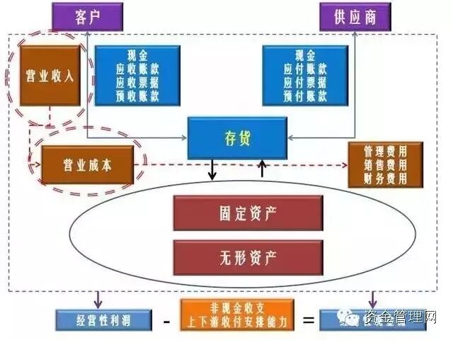 从图中可以看到,上游是供应商,然后通过现金、应付账款、应付票据、预付账款,然后会对公司形成存货,我们进行采购。采购完了以后这个存货通过固定资产、无形资产形成了产成品,然后我们把产成品销售给我们的客户,如果我们能收回现金我们就会得到现金,如果我们不能收回现金,那有可能我们会影响应收账款或者是应收票据。如果我们的产品非常地好,比如说像茅台这样的产品,如果你不给它提前打款拿不到货的,所以它会有预收账款,我们发生了销售收入的同时,同时会确认营业成本。每隔一段时间会发现三大期间费用,管理费用、销售费用、财务费用,这就是一个基本的整个供应链的体系。