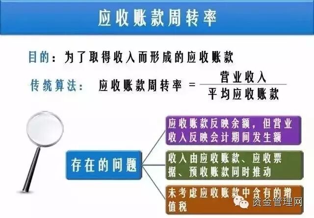 对应收账款其实我们有很多算法,都跟应收账款有关,其中最有名的一个是“应收账款周转率”,应收账款周转率他主要的目的是我们为了取得收入而形成的应收账款是多少。一个传统的算法,就是“应收账款的周转率=营业收入÷平均的应收账款”。