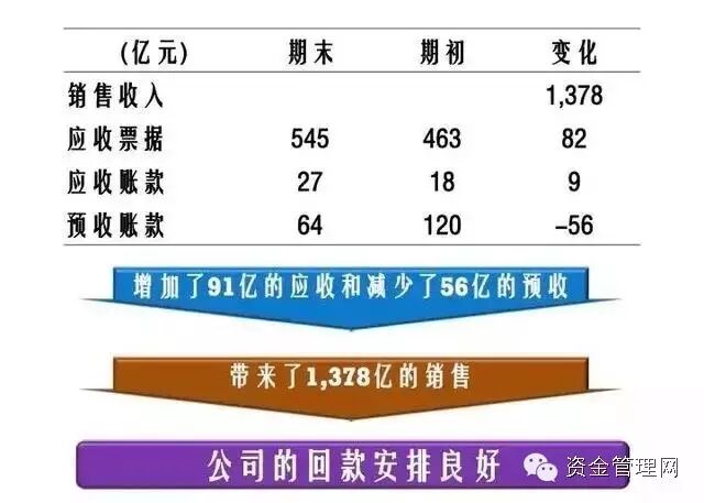 像我们刚才一开始所说的,我们要把应收账款、应收票据、预收账款和我们的营业收入做一个比较,我们的营业收入1378亿,我们把所有的这些内容给他列到一张表里面,我们就可以发现我们的营业收入他产生的是1378亿,我们的应收票据其实是增加了82亿,我们的应收账款是增加了9亿,我们的预收账款是减少了56亿。总体来说,格力在2014年的时候增加了91亿的应收账款和应收票据,减少了56亿的预收,但是他带来了1378亿的销售。也就是说他,他所增加的收不回来的钱是增加了147亿,但是他带来了1378亿的销售。大概是10%的营业收入是没有收回来的,这个公司的回款安排总体来说是非常良好的。