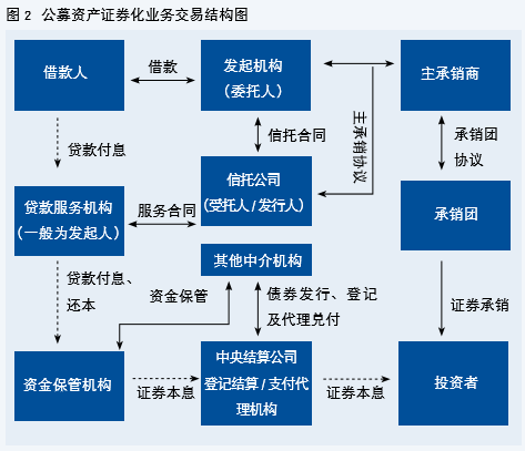 从图 2 可以看出:信托公司在资产证券化业务的交易框架中起着核心作用。其一,信托公司处于交易结构的中心,在所有交易过程中,只有发起人和信托公司签署《信托合同》,在该合同中,信托公司是乙方;而其他中介机构都与信托公司签署《服务合同》,信托公司均是甲方。其二,面对主管机关,信托公司是撰写申报文件的主体。其三,信托公司不仅是受托人,在受托资产隔离中起着最为关键的作用,而且还是唯一向市场申请公开发行资产证券化产品的发行人。