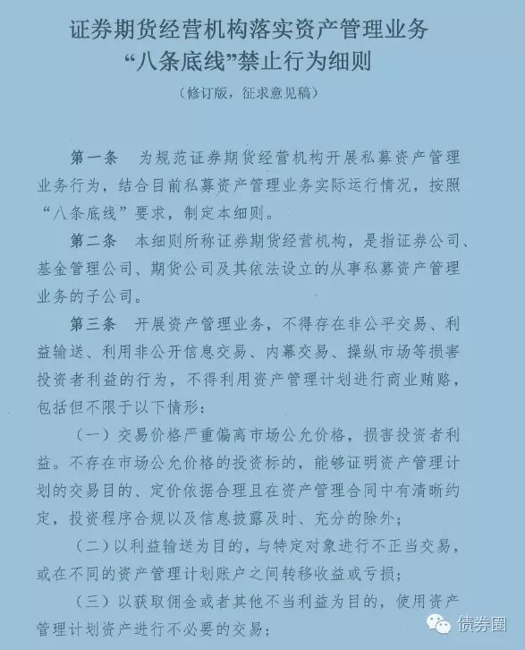 一、事实上,针对证券类资管业务的监管升级早在去年股灾后就已提出,彼时结构化分级资管产品的过高杠杆加剧了市场波动风险曾一度被监管层关注,而监管层曾多次对《“八条底线”细则》进行修订,而据接近监管层人士透露,最近一期的《征求意见稿》是汇总了此前多家机构和市场意见后所形成的拟定结论。