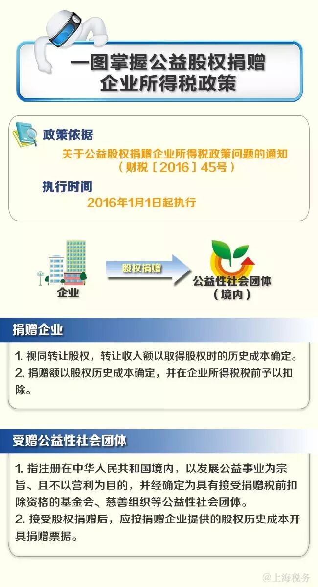 为支持和鼓励公益事业的发展,近期财政部、国家税务总局发布了《关于公益股权捐赠企业所得税政策问题的通知》(财税〔2016〕45号),对相关问题进行了明确。快来看看图解让您轻松掌握相关政策。