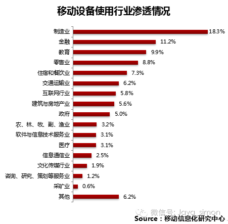三、制造业更钟爱移动终端:在用户的行业分布方面,制造业更受青睐,分别占到18.3%,金融和教育分列二、三位,分别是11.2%,9.9%。