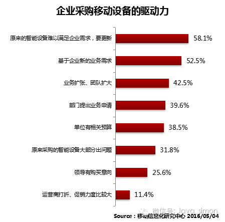 企业更新移动设备的主要驱动力有设备难以满足企业需求、新业务的涌现、原有业务的扩张。分别占了58.1%,52.5%,42.5%。