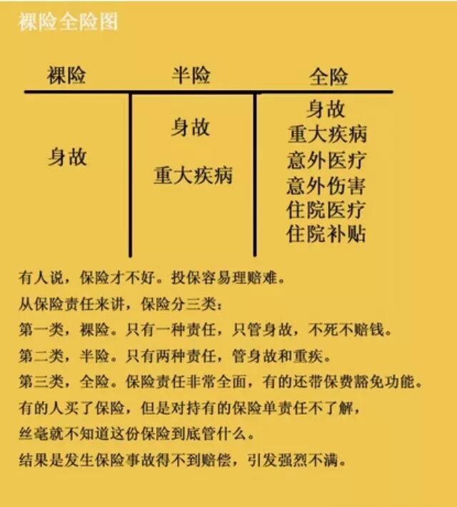 素材:保险自媒体联盟保险分为裸险、半险和全险,看看自己的保单吧,有时候真不是保险公司不理赔,而是你买的保险根本不在理赔范围内!很多人都说