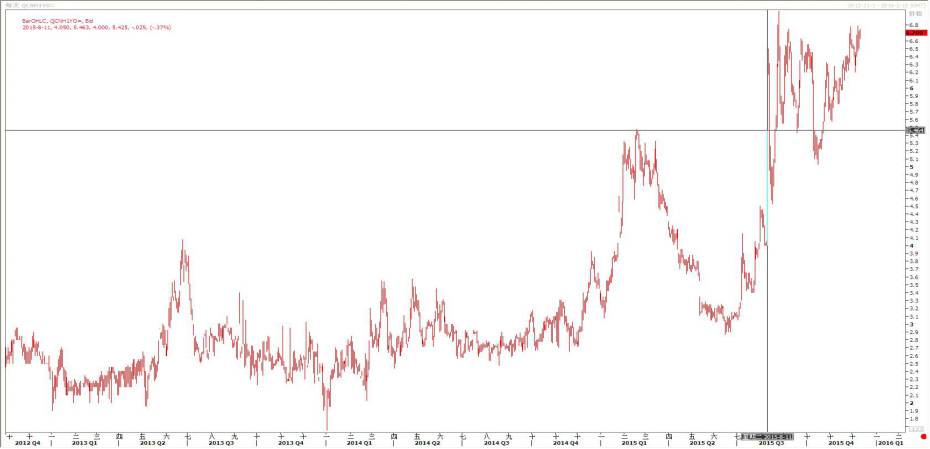 上述就是本文对2014年以前决定香港市场CNH价格走势变化的一些猜测,接下来我们可以以上内容为基础,看看2014年以后发生了什么。其实早在2013年底,舆论的风向就开始偏转,什么经济增长放缓,资本流出压力开始显现等等,人民币贬值的声音逐渐增强,随后每期GDP数据的持续下滑反过来又加强了市场对人民币贬值的预期。于是问题就来了,在CNH市场由于积累了太多套利盘,我们假设套利盘的人民币资产端是在海外人民币债券上。这个时候套利者的行为会是怎么样呢?由于市场预期的偏转,人民币资产端的持有者需要更高的报酬才愿意持有人民币,于是人民币债券利率不断升高,价格有巨大下行的压力。这个时候套利者会卖出人民币债券,拿到人民币后和银行办理远期提前交割或自己在市场上叙做近端买入美元卖出人民币,远期卖出美元买入人民币对冲原来的远期交易,然后将当期拿到的美元偿还美元的借款,自此套利盘解锁完毕。可见只要套利盘解锁,一定伴随以下的特征:1、CNH人民币即期汇率被不断推低。2、美元融资利率下降。3、香港人民币利率上升。特征1在2014年第一季度出现了(见图二),特征3在2014年底左右出现了。(见图一)。回忆2014年初的情况,人民币即期汇率由升转贬似乎是由境内CNY所带动的,更像是为扭转市场升值预期所走出的行情。2014年底开始的贬值行情更向由境外CNH套利盘解锁所带动的,但当时解锁似乎仅停留在基础交易层面,并未波及到数额巨大的衍生品层面。真正的考验在2015年8月11日,央行扩大人民币汇率的波动区间、实行人行开盘价和市场价并轨并下调汇率2%,央行此举同时影响了即期市场和人民币期权市场,当时CNH1年期的波动率由4.0%左右跳升至5.4%(图三),并在随后一天上升