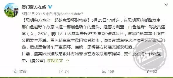 另据海峡都市报报道,5月21日,思明公安分局经侦大队接到多名群众报警称,他们通过厦门招宝汽车租赁有限公司(简称“招宝公司”)的“招宝网”融资租赁平台购买汽车理财产品,获取抵押车辆的使用权及每月的利息收益。今年4月起,该公司抵押给债权人的车辆陆续“丢失”,怀疑是被原车主开走的。