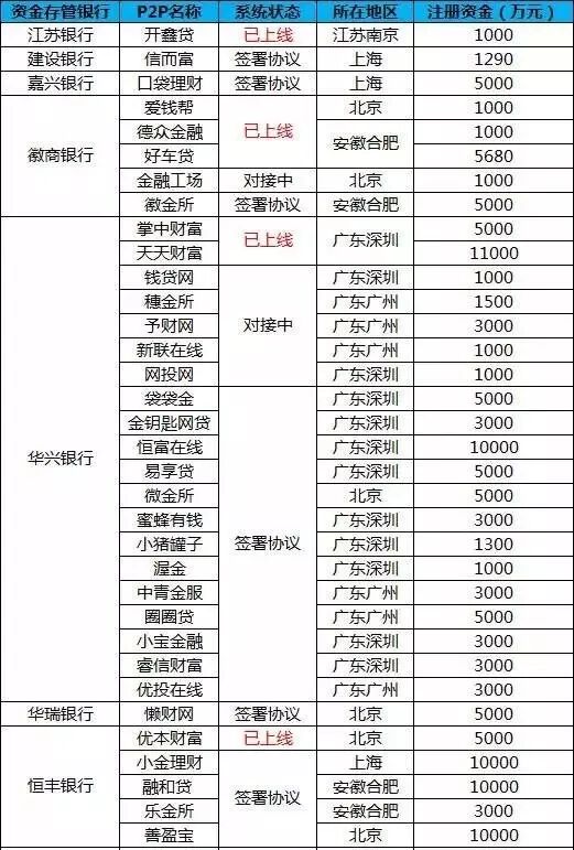 表1 P2P银行资金存管名单