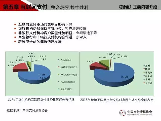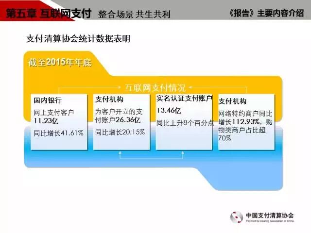 报告显示,截至2015年年底,非银行支付机构开立的支付账户总量为26.36亿个,其中个人支付账户26.30亿个,完成实名认证的支付账户共有13.46亿个,占支付账户总量的51.07%,比2014年上升8个百分点。随着《非银行支付机构网络支付业务管理办法》的颁布实施,网络支付业务将步入进一步规范健康发展的全新阶段。