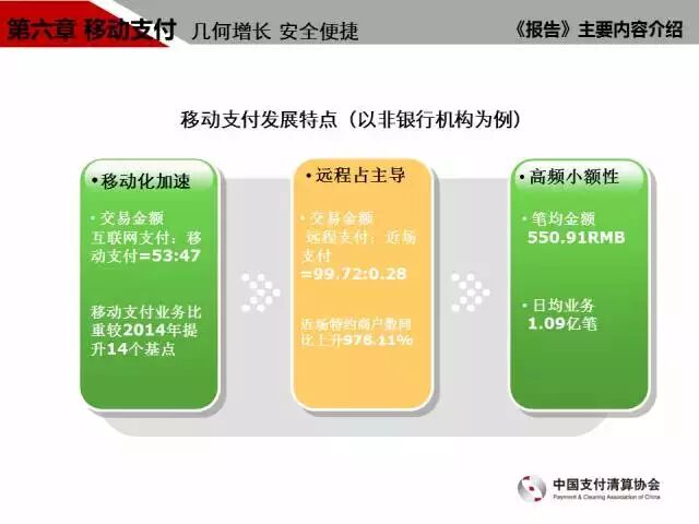 与互联网支付相比,移动支付仍保持着高速增长的态势。在2015年,银行的移动支付业务笔数与金额同比分别增长205.86%和379.06%;而支付机构则同比分别增长160%和166.5%。