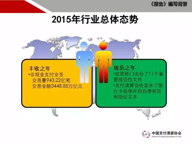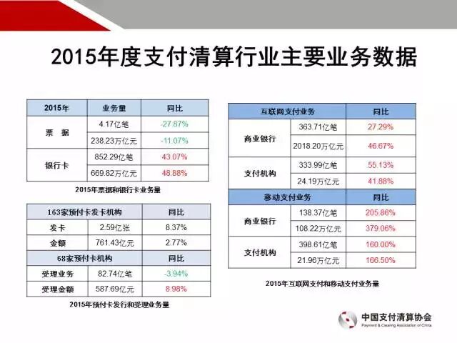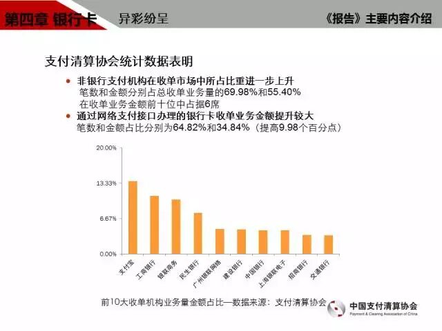 报告显示,2015年,非银支付机构处理的银行卡收单业务达到393.87亿笔,27.92万亿元,占比分别为69.98%和55.40%;商业银行处理的银行卡收单业务达到168.97亿笔,22.48万亿元,占比分别为30.02%和44.60%。