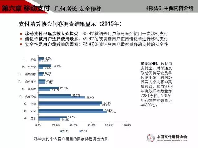 报告中关于支付清算协会一项问卷调查结果显示,2015年,超八成用户每周至少使用一次移动支付,移动支付的安全性是用户最看重的因素。