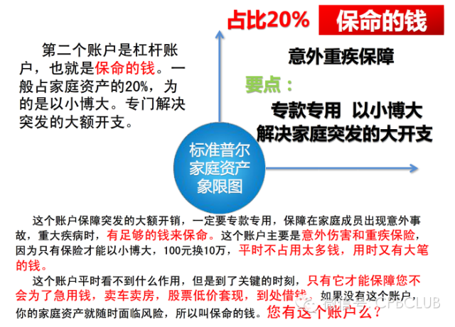 第二个账户是杠杆账户,也就是保命的钱,一般占家庭资产的20%,为的是以小博大。专门解决突发的大额开支。