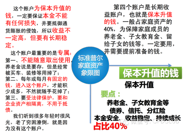 这个账户为保本升值的钱,一定要保证本金不能有任何损失,并要抵御通货膨胀的侵蚀,所以收益不一定高,但却是长期稳定的。