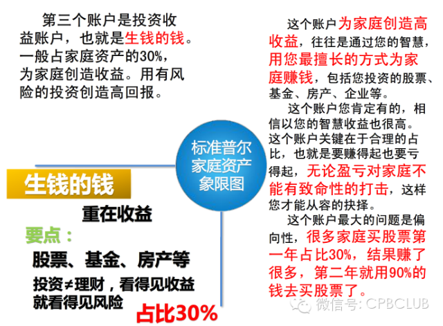 第三个账户是投资收益账户,也就是生钱的钱。一般占家庭资产的30%,为家庭创造收益。