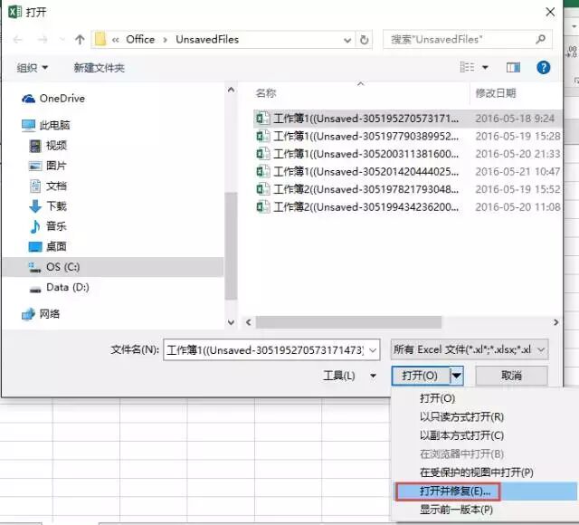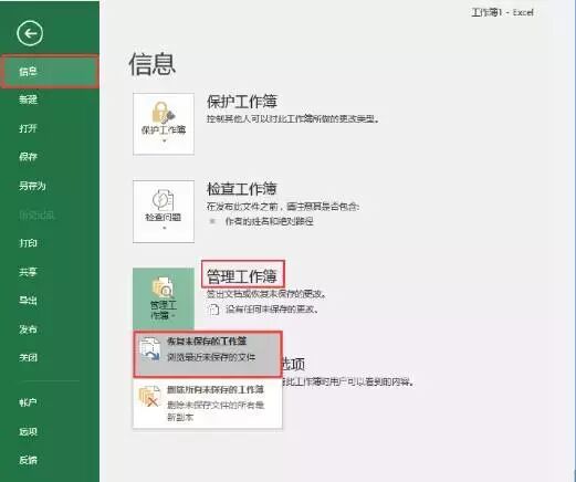 如果还找不到,则可以点击 文件>信息>管理文档>恢复未保存工作簿,未保存的文档,都会存在一个叫“UnsavedFlies”的文件夹内。