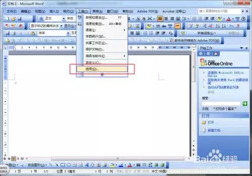 1、首先打开word文档,在菜单栏上找到“工具”点击下拉找到“选项”按钮,随后便会弹出对话框: