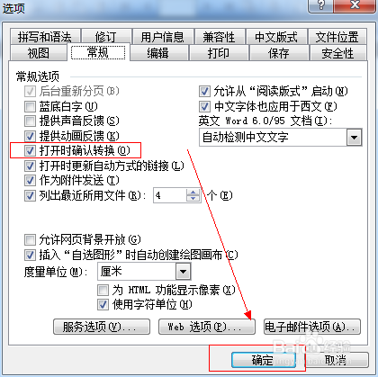 2、在弹出的对话康中,找到“常规”选项卡, 找到“打开时确认转换”复选框,然后勾选上该选项并确定。