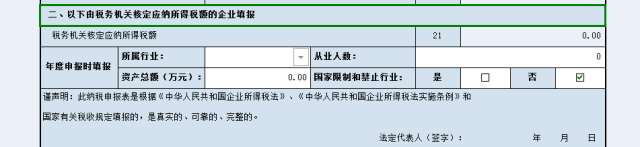 (1)填报《企业所得税月(季)度预缴和年度纳税申报表(B类)》“年度申报时填报”栏的“所属行业”、“资产总额”、“从业人数”和“国家限制和禁止行业”。