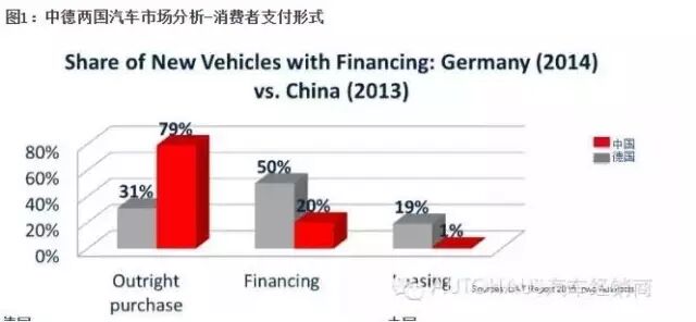 接下来,分析一下消费者购车的消费行为。图中是以2014年的德国与2013年的中国进行比较,红色部分是中国的消费。在中国,现金消费仍然是购车的主要消费形式(Outright purchase),其次是金融购车(Financing),第三个是融资租赁的形式购车(Leasing)。其中,融资租赁的占比仅1%。