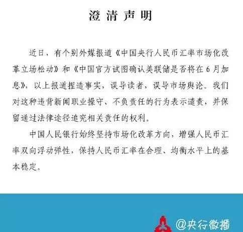 5月27日下午,央行微博紧急发布澄清声明。央行否认试图确认美联储6月是否加息。近日,个别外媒报道《中国央行人民币汇率市场化改革立场松动》和