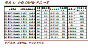 2010 年11 月23 日,中国首创的CRMW 正式上线。中国首批4 只信用风险缓释凭证(CRMW)完成认购缴款和登记确权,于2010 年11 月24 日开始在银行间市场交易流通。首批4 只CRMW 名义本金共计4.8 亿元,其中:中债信用增进2010 年第一期CRMW(凭证代码021001001),标的实体为中国联通公司,标的债务为10 联通MTN2,实际创设名义本金总额1.3 亿元,凭证创设价格0.87 元/百元面值,保障期限1032 天。中债信用增进2010 年第二期CRMW(凭证代码021001002),标的实体中国联通公司,标的债务10 联通CP02,实际创设名义本金总额1 亿元,凭证创设价格0.3 元/百元面值,保障期限301 天。交通银行2010 年第一期CRMW(凭证代码021002001),标的实体为TCL 集团公司,标的债务为10TCL 集CP01,实际创设名义本金总额5000 万,凭证创设价格0.35 元/百元面值,保障期限9个月。民生银行2010 年第一期CRMW(凭证代码021003001),标的实体为云南铜业(集团)有限公司,标的债务为10 云铜CP01,实际创设名义本金总额2 亿元,凭证创设价格0.23 元/百元面值,凭证到期日2011年10 月20 日。此后截至2011 年3 月底,共有9 只CRMW上线。