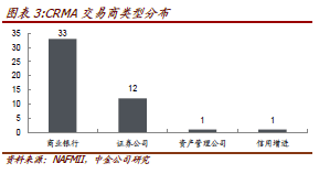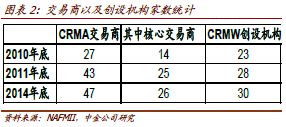 参与主体以商业银行为主。截止2014 年底,47 家CRMA交易商名单中,商业银行达到了33 家,证券公司为12家,另外两家分别为中债信用增进以及中国长城资产。26 家核心交易商中除中金和中信为证券公司外,其余24家均为商业银行类机构。CRMW 创设机构当中,22 家为商业银行机构,7 家为证券公司,剩余1 家为中债信用增进。由此可见,CRM 市场参与主体较为单一。
