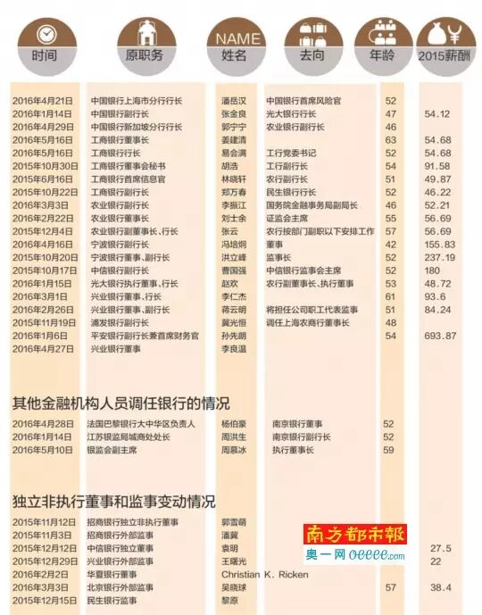 就在2016年1月,就有4家银行高管变动。中国银行副行长张金良接任光大银行行长赵欢;而赵欢赴农业银行担任行长;原农行行长张云因严重违纪被撤职;平安银行副行长兼首席财务官孙先朗因个人原因辞职。