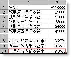 在工作表的B1:B6输入数据“函数.xls”所示,计算此项投资四年后的内部收益率IRR(B1:B5)为-3.27%;计算此项投资五年后的内部收益率IRR(B1:B6)为8.35%;计算两年后的内部收益率时必须在函数中包含g,即IRR(B1:B3,-10%)为-48.96%。