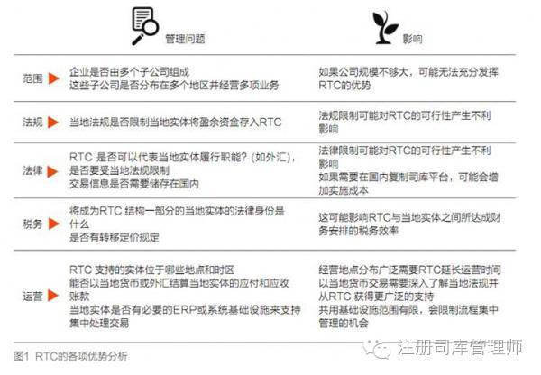 RTC的主要职责是在实际或理论上将所有的现金盈余集中在一起,集中管理集团区域内的现金盈余,从而实现在集团内部重新配置现金盈余,为现金短缺的实体提供资金。此举可以大幅节省筹资成本。 RTC可以通过在共享服务中心(shared services center, SSC) 中帮助合并付款和收款业务,或是使用支付工厂(payment factory),利用RTC集中来自不同业务部门的付款申请,来提高付款和收款流程的效率。RTC还可以为付款和收款流程提供“代理付款”(pay-on-behalf-of,POBO)或“代理收款”(receive-on-behalf-of,ROBO)模式,通过RTC控制的中央账户来处理交易。无论使用哪种方法,一般都会在企业与其主要银行之间设置银企直联(host-to-host),以便在直通式处理(straight-through-process, STP)基础上支付款项,同时进行数据收集,并将收集的数据用于银行或企业系统的对账。 净额结算中心 大型企业通常有大量需要按月结算的公司间交易。净额结算中心将采用多边净额结算解决方案,对这些公司间交易进行净额结算。这样,每个子公司只需通过RTC 在净额结算基础上进行结算。目前,大多数司库管理系统(treasury management system, TMS) 或ERP系统均可提供净额结算中心功能。 外汇中心 有些企业要求所有子公司与RTC,而非银行,进行外汇套期保值交易,从而利用RTC集中管理外汇敞口。因此,RTC能够获得所有外汇敞口,在RTC中完成后续的净额结算。然后,RTC将只与其银行交易其净头寸。 合并和整合