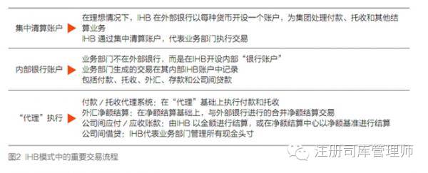 内部银行(in-house bank, IHB)结构是最复杂的司库模式之一。IHB 用于向组织内的业务部门提供银行服务,例如现金管理、外汇、筹资和营运资金。采用此模式意味着业务部门不再需要从外部银行获得该类服务,从而可大幅节省筹资成本,降低或省去交易费用并提高运营效率。IHB模式一般包括IHB层级的集中式银行账户、“代理”执行和通过IHB账户的公司间交易的内部结算。IHB 模式中的重要交易流程(见图2)。