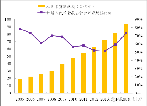 图9: 2005年以来人民币贷款规模及新增人民币贷款占社会融资规模比例
