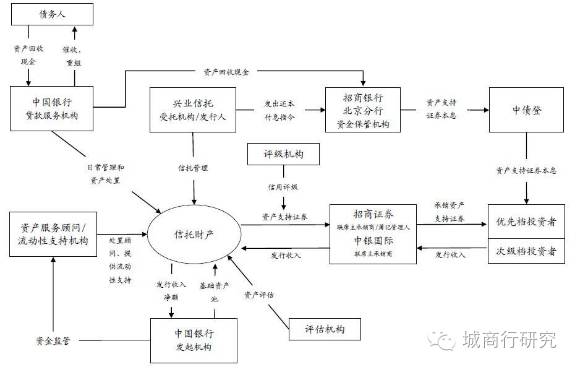 根据《信贷资产证券化试点管理办法》的定义,信贷资产证券化指的是银行业金融机构作为发起机构,将信贷资产信托给受托机构,由受托机构以资产支持证券的形式向投资机构发行受益证券,以该财产所产生的现金支付资产支持证券收益的结构性融资活动。一笔标准的信贷资产证券化交易通常涉及发起机构、受托机构、贷款服务机构、资金保管机构、证券登记托管机构、资信评级机构、信用增级机构、承销机构以及其他为证券化交易提供服务的机构和资产支持证券投资机构。以2013年工商银行发起、中海信托发行的2013年工元一期信贷资产支持证券为例,总发行规模35.92亿元,其中优先AAA档30.4亿元,优先AA档1.70亿元,次级档3.82亿元,工商银行是发起机构(委托人),中海信托是发起人(受托机构),建设银行是资金保管机构,中金公司和中信证券是联席主承销商。