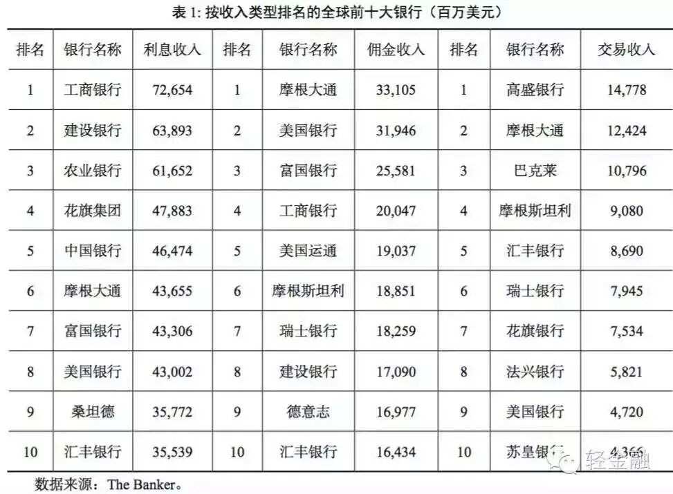 欧美银行在交易业务方面起步较早。英国《银行家》杂志对全球 1000 家大银行 2014 年 经营收入类型的排名显示,中国的四大银行净利息收入规模排名全球前 5 位,但交易收入前10 位完全由美欧大型银行垄断。其中,高盛银行的净交易收入达 147.8 亿美元,在所有银行中 居首位,其交易收入占非息收入的比重达 47%(见表 1)。不同银行的交易收入来源各不相同,如汇丰控股的交易收入主要来源于环球银行及资金市场;摩根大通的交易型业务收入主要来源 于机构及投资银行业务,包括衍生品交易、私人股权投资、做市、外汇等。