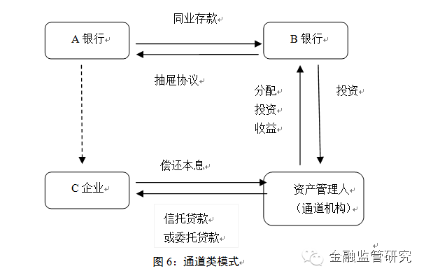这是银行通过理财产品募集资金,再与信托公司、证券公司、基金公司或银行同业等第三方进行合作,将理财资金对接第三方发行的资管计划的运作模式(见图6)。该模式主要是为规避监管约束、指标限制和投资标的限制等,借助第三方实现资产转移出表的目的。其主要运作模式是商业银行对自己无法直接投资的融资标的,借助信托、券商、基金公司等将其设计成相关信托计划、资管产品,银行再以购买信托计划、资管产品的名义间接投向融资标的(多为受限行业、地方融资平台等领域)。其一般具有跨区域、跨行业、采用抽屉协议等三个特点。