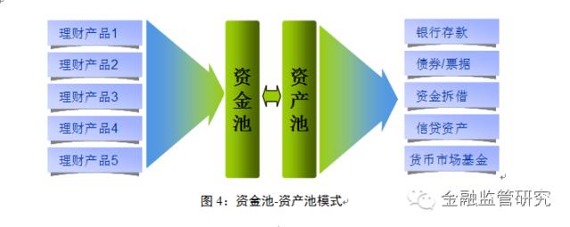 该模式统一资金运用,通过滚动发售不同期限的理财产品持续性募集资金,并将募集资金集合起来统一运用,投资于债券、回购、信托融资计划、信贷资产、信托受益权、券商资产管理计划等集合性资产包,以动态管理保持理财资金的来源和运用相对平衡(见图4)。该模式是一种类基金化的运作,具有“滚动发售、集合运作、期限错配、分离定价”的特点,直接助推了理财业务规模的高倍增长。《2013年第一季度货币政策执行报告》显示,银行资金池理财产品占全部表外理财产品总数的比例超过50%,且资产池下的标的资产丰富,涵盖了存款、债券、票据、信贷资产、信托受益权、券商资产管理计划等等。该模式也暴露出了期限严重错配、信息不透明、资金进入限制性领域、风险隔离形同虚设、刚性兑付使得风险积聚在银行体系内、流动性风险突出等诸多问题,引起了社会高度关注和质疑。2013年,监管部门出台8号文,专门治理资金池模式。此后,理财业务运作模式逐步回归转型。