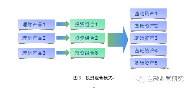 此为一个理财产品投资于多个标的资产的模式。该模式下,投资标的非单一市场或工具,而是包含了跨市场、多种投资工具的标的资产(见图5)。其在产品期限和组合设置方面较单一投资对象更为灵活,投资标的较资产池模式更为明确,成本收益核算清晰,产品透明度较高。由于投资组合标的分散,可避免单一投资对象市场大幅下跌或某一信用主体违约下跌带来的投资损失。该模式以其独特的灵活性和强大的资产配置能力,成为当前及未来理财产品的发展趋势。尤其是运用金融技术,将存款、债券等固定收益产品与金融衍生品(远期、期权、掉期等)组合在一起的新型结构性组合模式更受青睐,也更有利于发挥银行主动管理、组合投资的专业技术优势,提升理财投资收益。