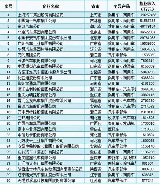 2016年5月26日,中国机械工业百强企业汽车工业三十强企业信息发布会在东莞召开,会议发布了2015年机械工业百强、汽车工业三十强企业名单。上汽集团以120,252,468万元的营业收入排名首位,其后依次是一汽、东风、北汽、长安。