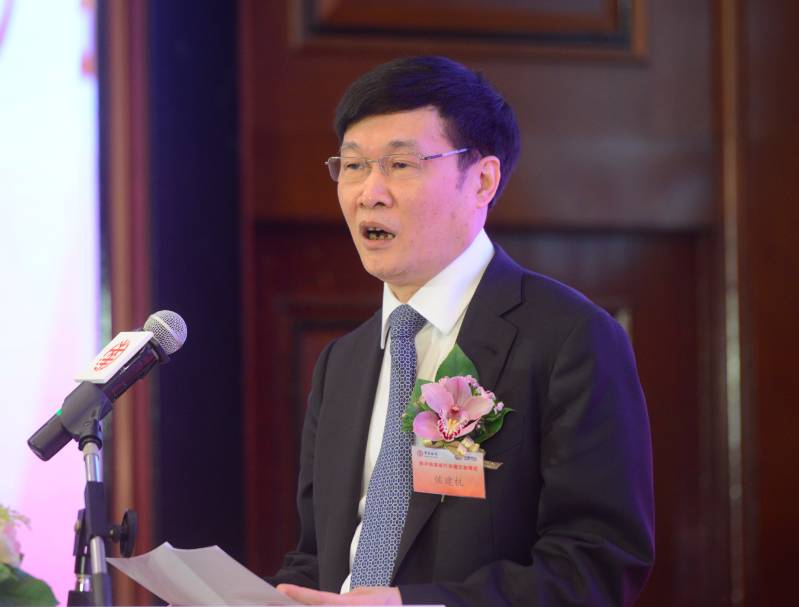 图为南洋商业银行股权交割仪式现场,中国信达董事长侯建杭致辞