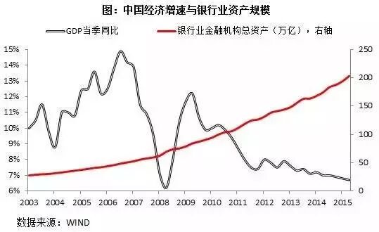 当经济处于上行期时,银行业会以更快的速度扩张,例如在危机前,2003年至2007年期间,中国银行业资产规模扩张了2倍,同时中国经济平均增速接近12%。