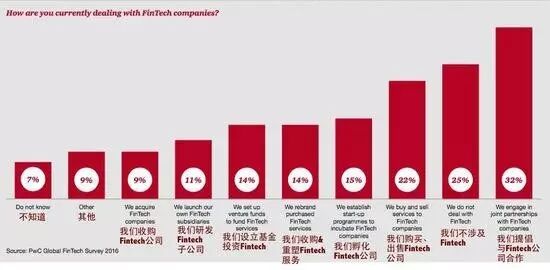 由此分布可见,Fintech公司不仅已成为VC的热门话题,还渗透至整个金融行业。然而,Fintech目前在金融圈的影响力仍很局限。根据PwC上月颁布的一项对美国金融机构的调查,25%不涉及Fintech,7%表示不知道如何应对Fintech。这种业内人士表现出来的被动与不知情,一定程度上低估了Fintech公司的潜力,忽略了它们对行业带来的影响,从而为金融行业埋下了潜在危机。