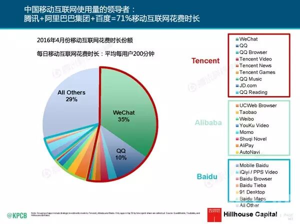 中国三大互联网巨头腾讯、阿里巴巴、百度占据了71%的移动互联网花费时长。