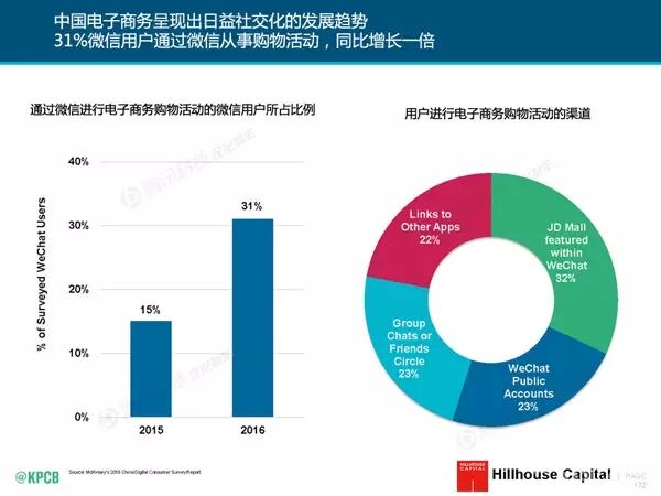 中国电子商务呈现出日益社交化的发展趋势,利用微信从事购物活动,增长较快。