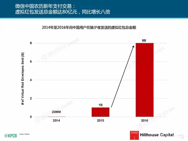 微信支付交易大增,2016春节期间虚拟红包发送额同比增长八倍。