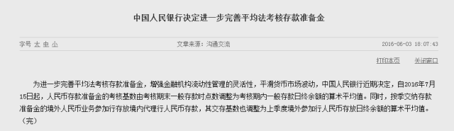 来源:21金融圈综合:央行官网,互联网金融网(hlwjrcn)私银圈等。中国央行周五(6月3日)称,为进一步完善平均法考核存款准备金,增强金融机构流动