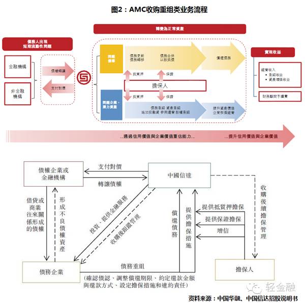 收购重组类业务则指AMC在不良资产的收购环节,即在确认债务债权关系的基础上,根据不良资产风险程度确定 实施债务或资产重组手段,并与债务人及相关方达成重组协议的业务。主要针对流动性暂时出现危机的企业,提供个性化定制的重组手段,进行信用风险重新定价并 将风险信用化解前移,发掘资产价值,在风险可控的情况下追求更高的重组溢价。