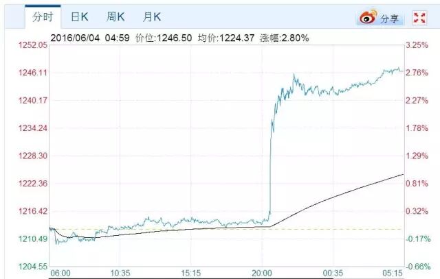 美元一崩溃,被压制了多日的黄金马上兴高采烈,大幅上涨: